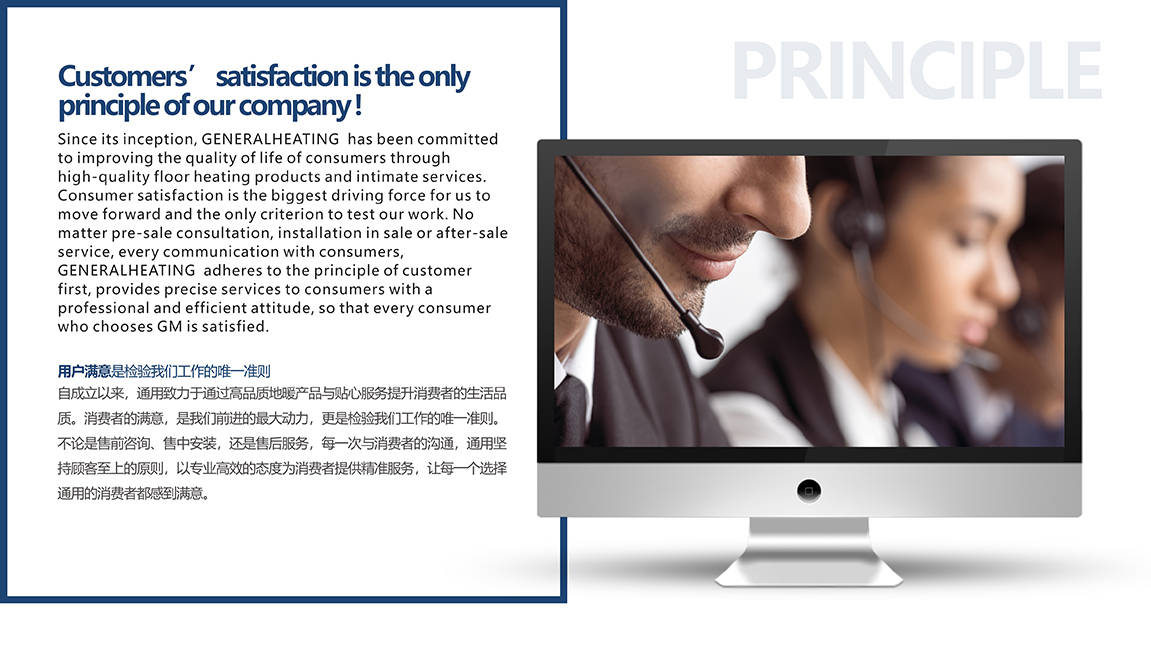 自成立以来,通用致力于通过高品质地暖产品与贴心服务提升消费者的生活品质。消费者的满意,是我们前进的最大动力,更是检验我们工作的唯一准则。不论是售前咨询、售中安装,还是售后服务,每一次与消费者的沟通,通用坚持顾客至上的原则,以专业高效的态度为消费者提供精准服务。让每一个选择通用的消费者都感到满意。