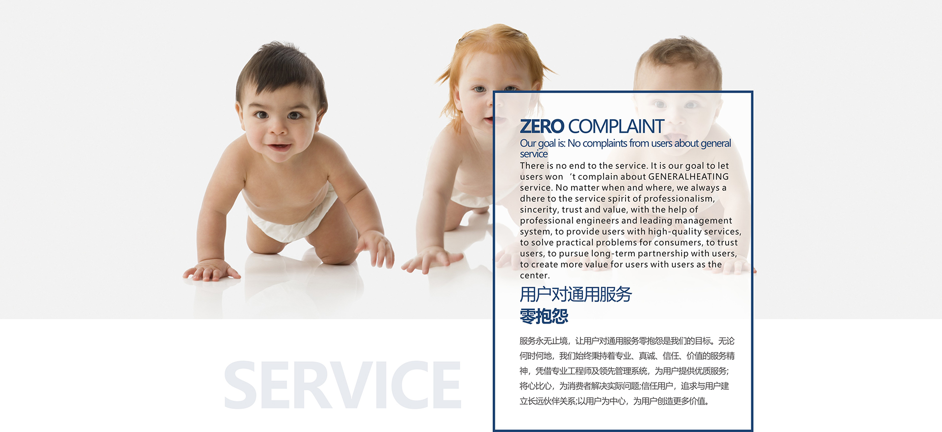 服务永无止境,让用户对通用服务0抱怨是我们的目标。无论何时何地,我们始终秉持着专业、真诚、信任、价值的服务精神,凭借专业工程师及领先管理系统,为用户提供优质服务;将心比心,为消费者解决实际问题;信任用户,追求与用户建立长远伙伴关系;以用户为中心,为用户创造更多价值。